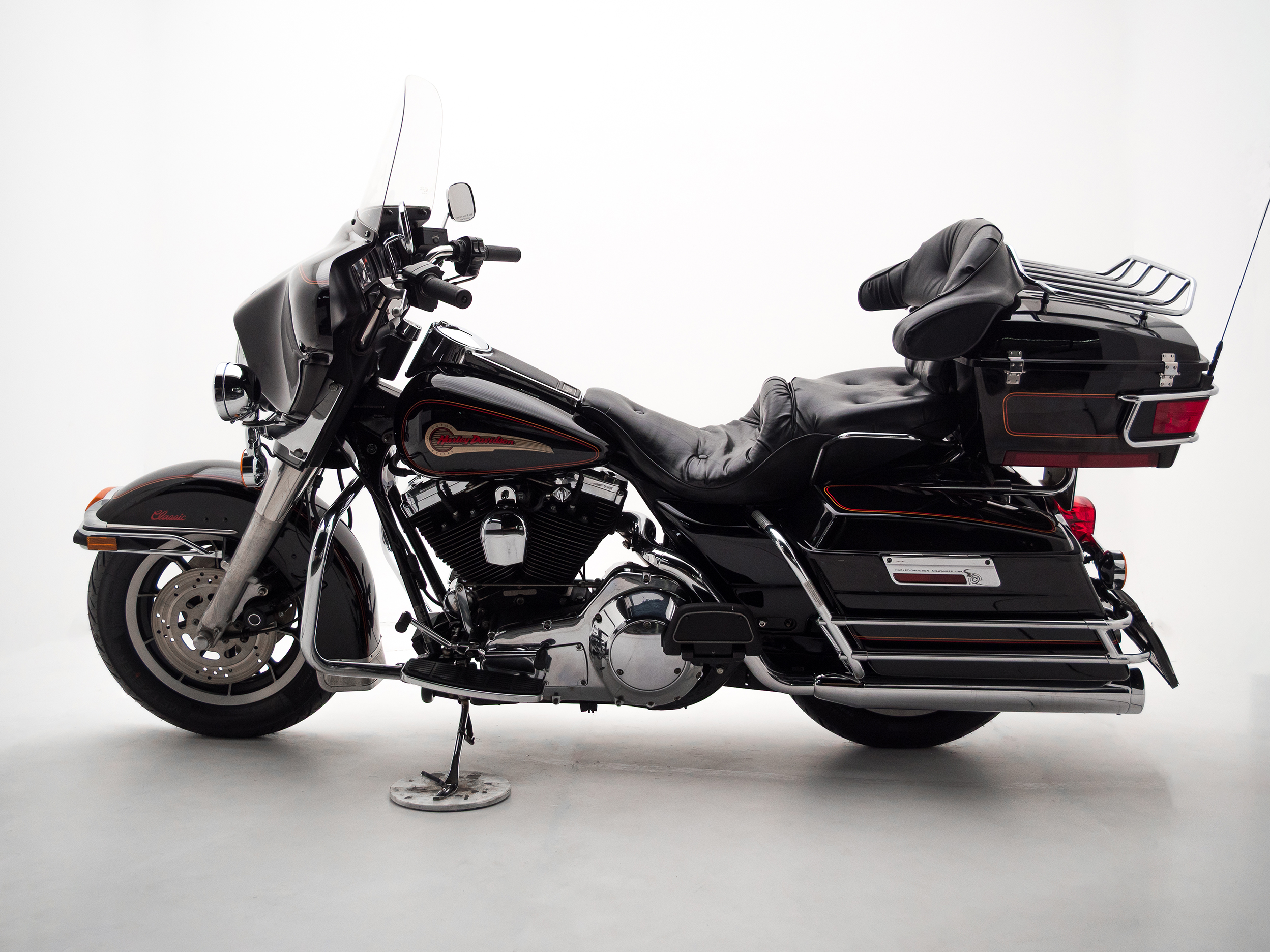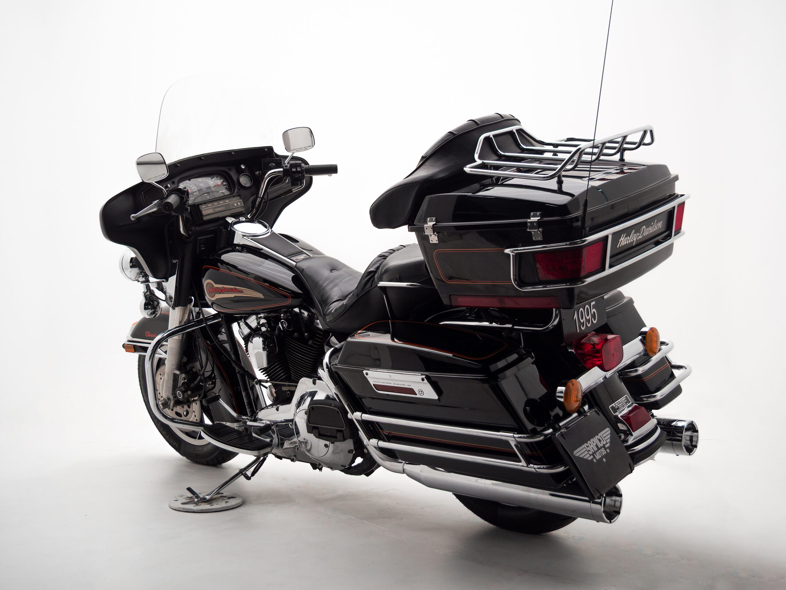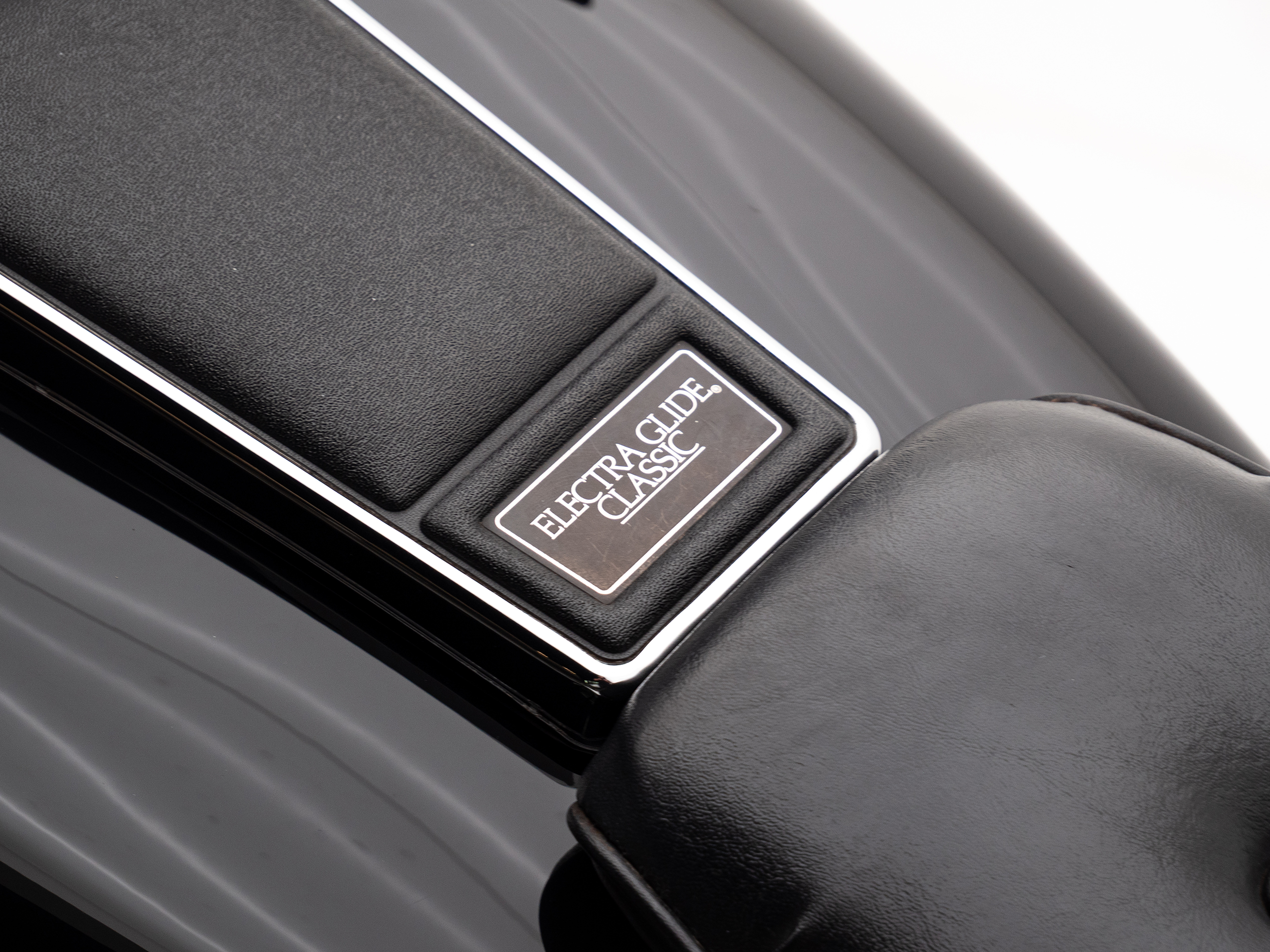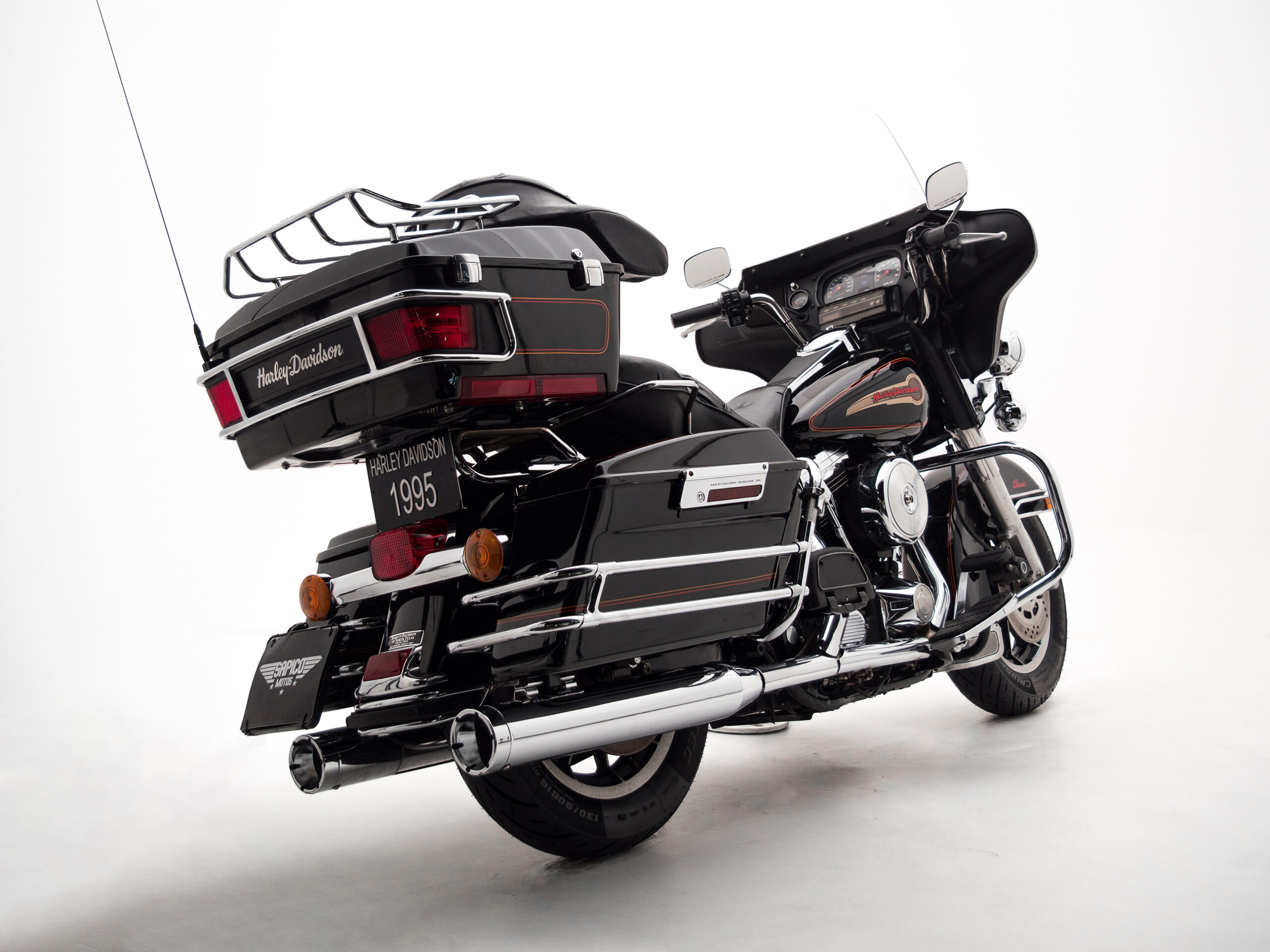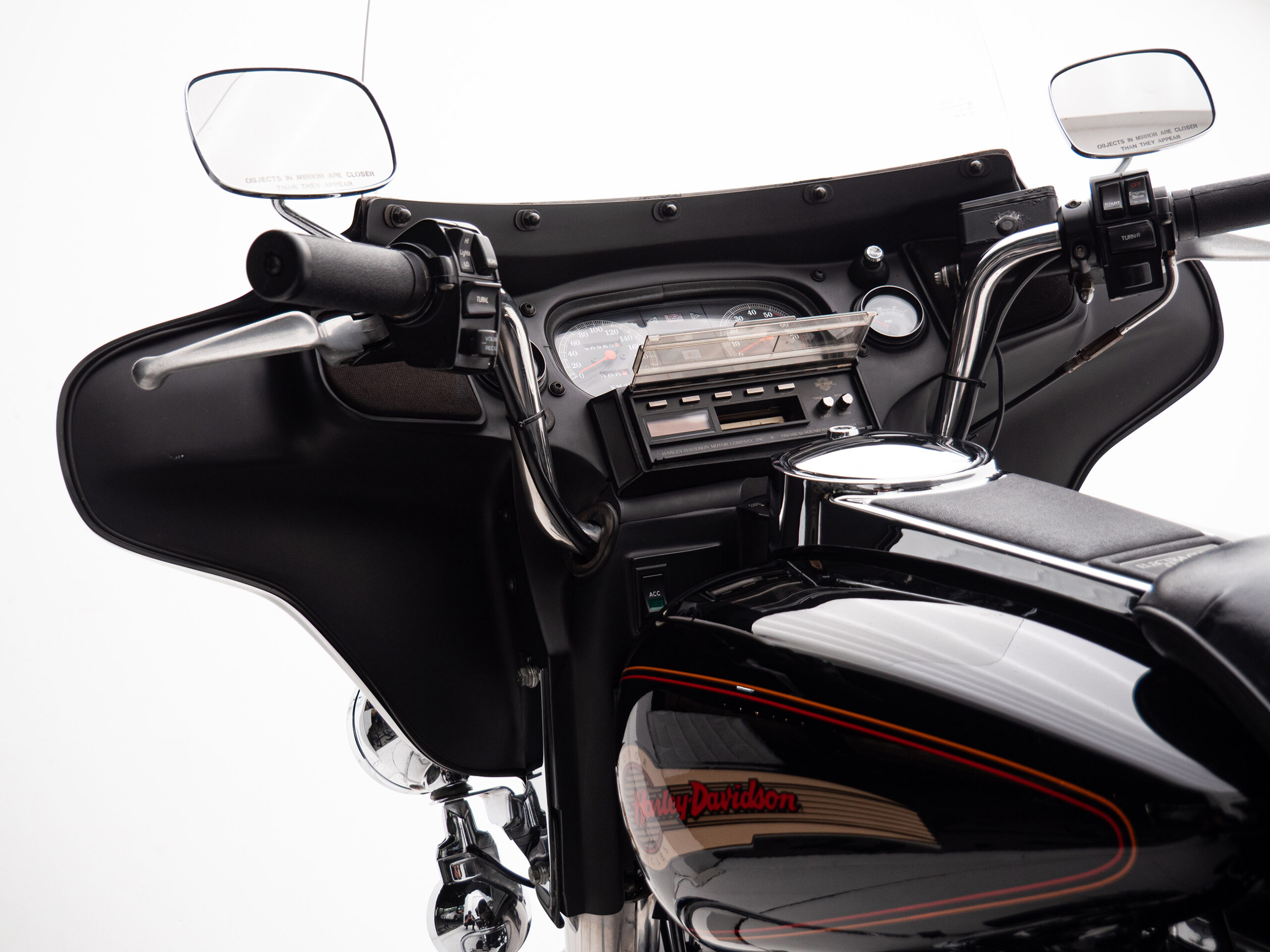 O rádio original HD toca fitas, traz um charme retrô que é impossível de ignorar. Com placa preta e um visual cheio de cromados, essa Electra Glide é rara no Brasil e carrega toda a essência da era de ouro da marca.