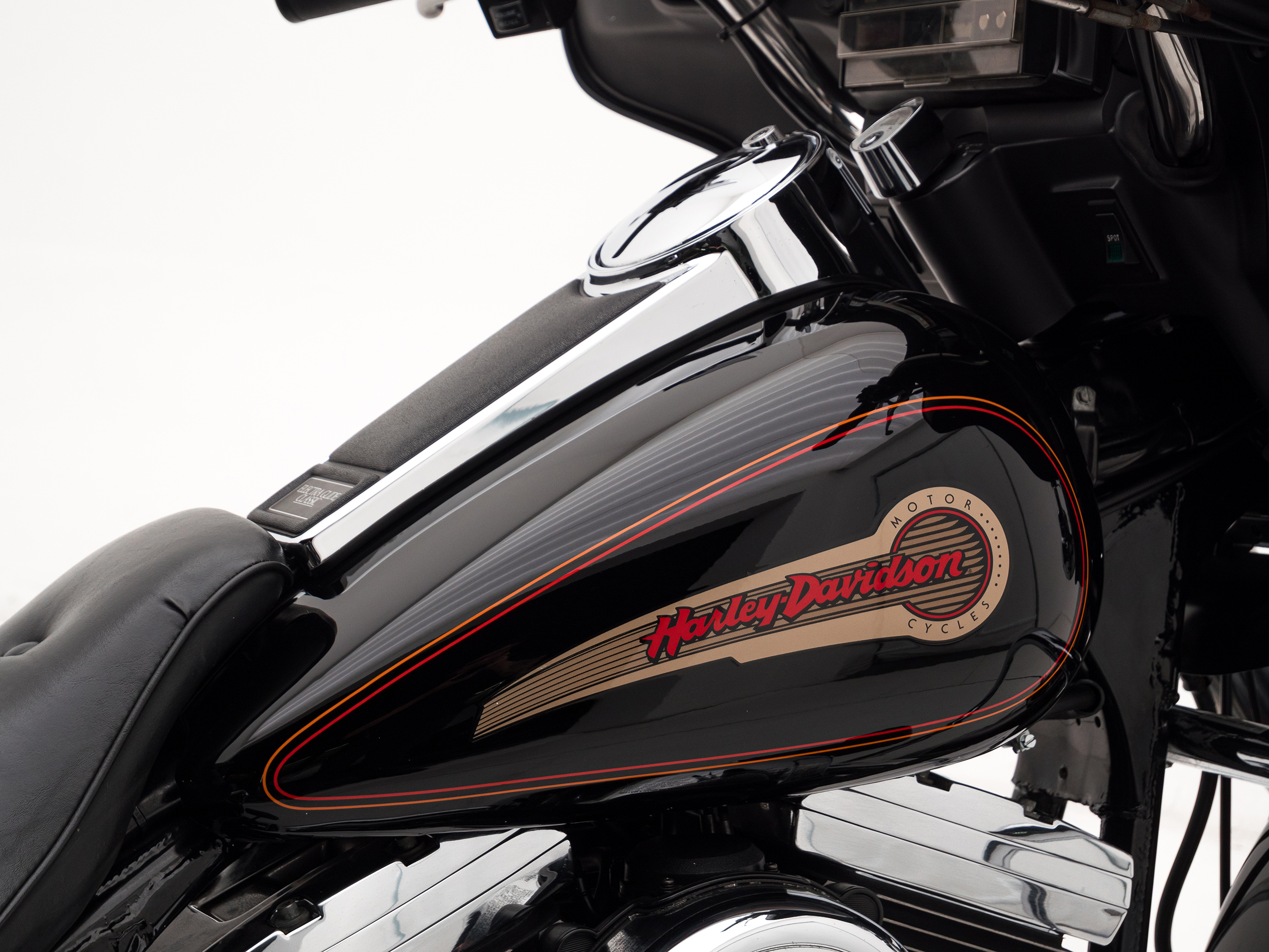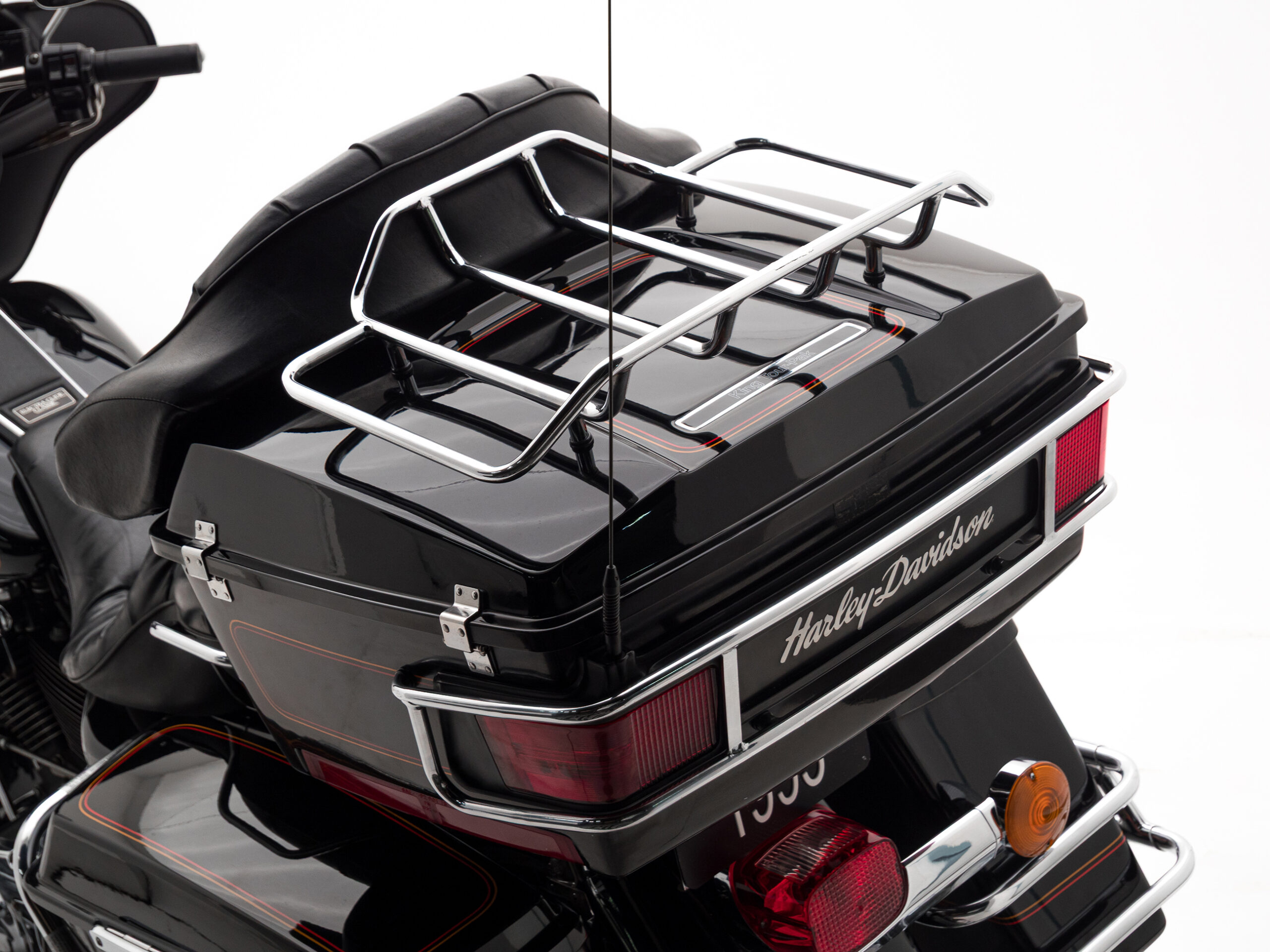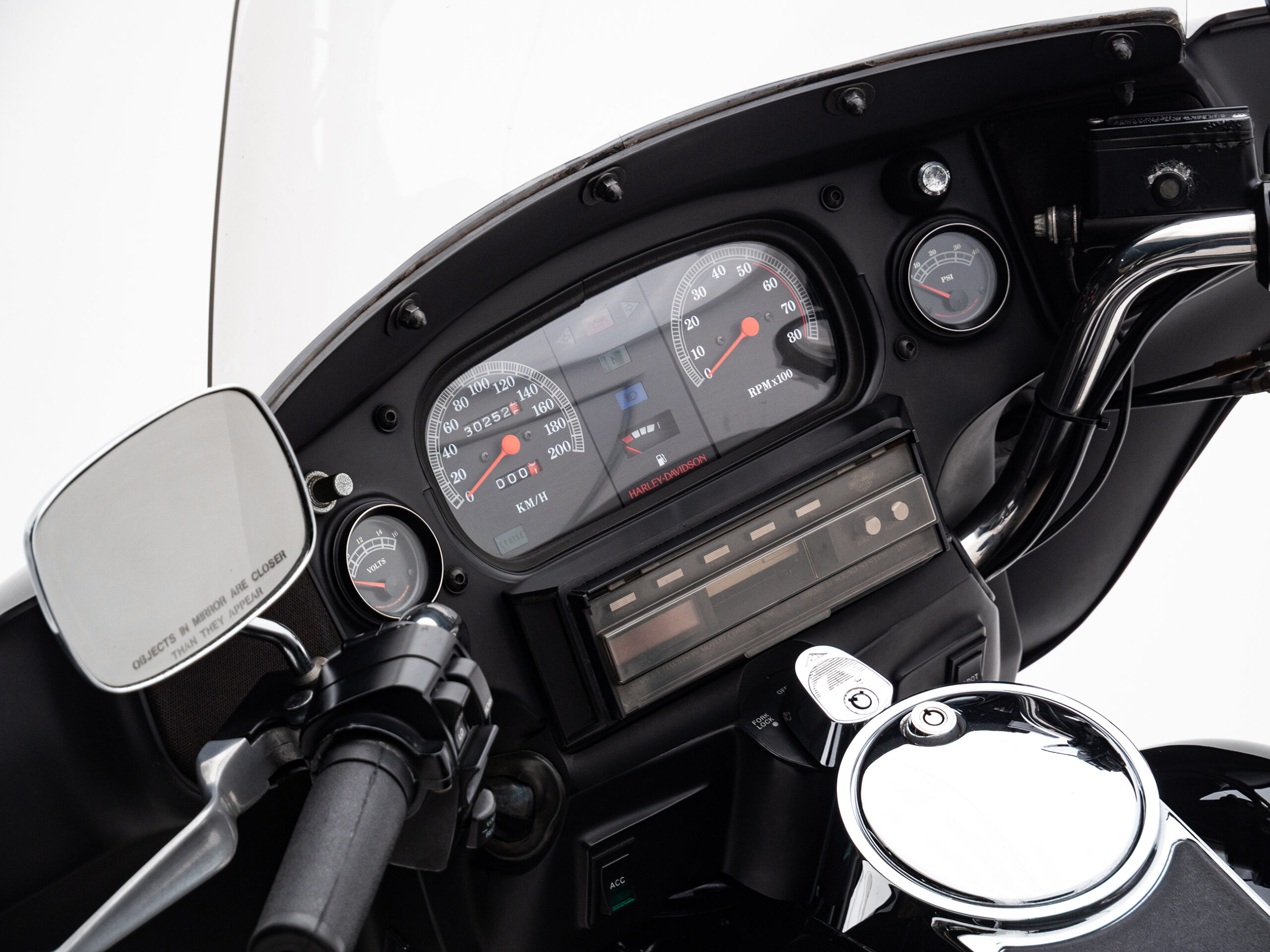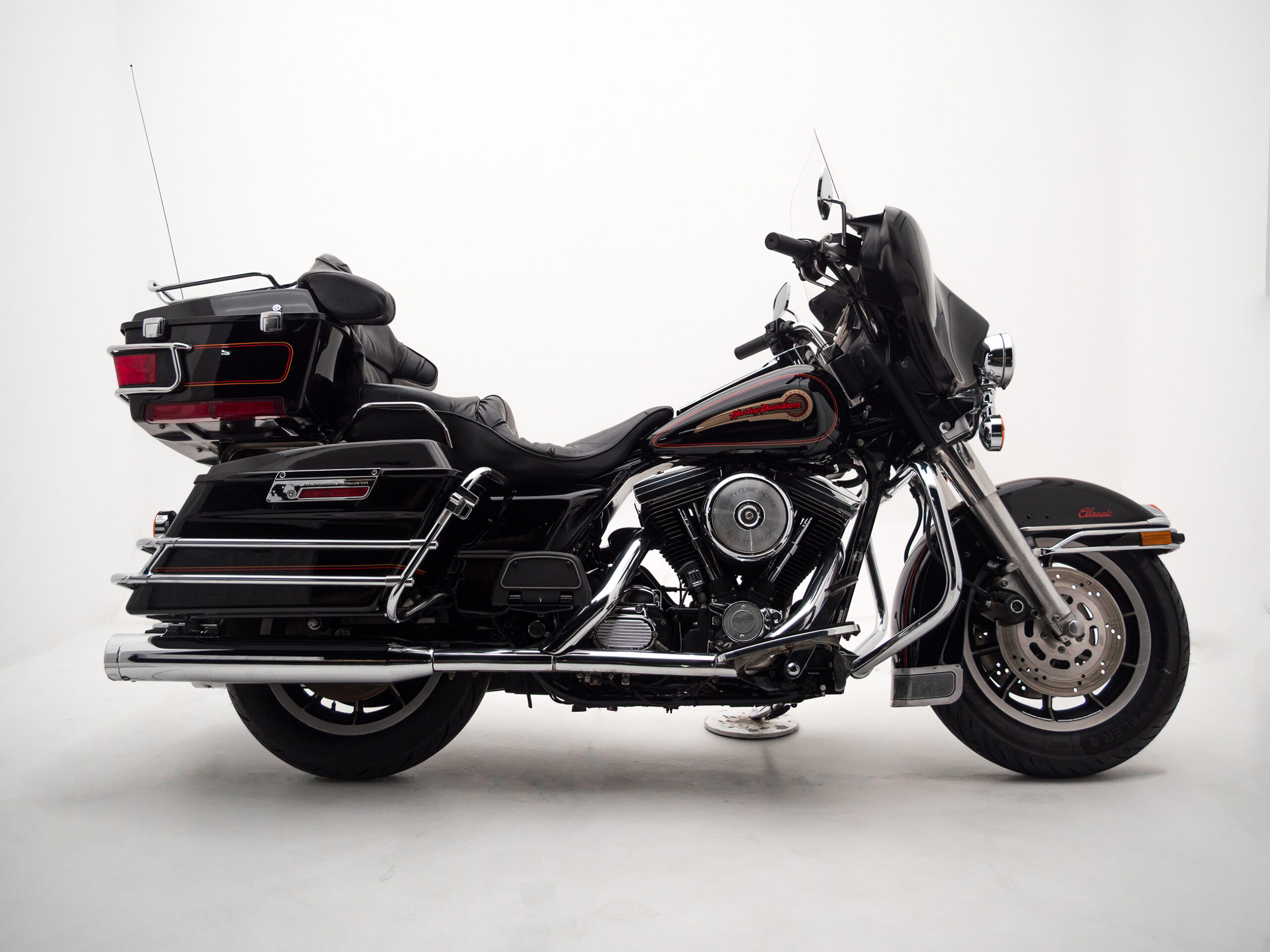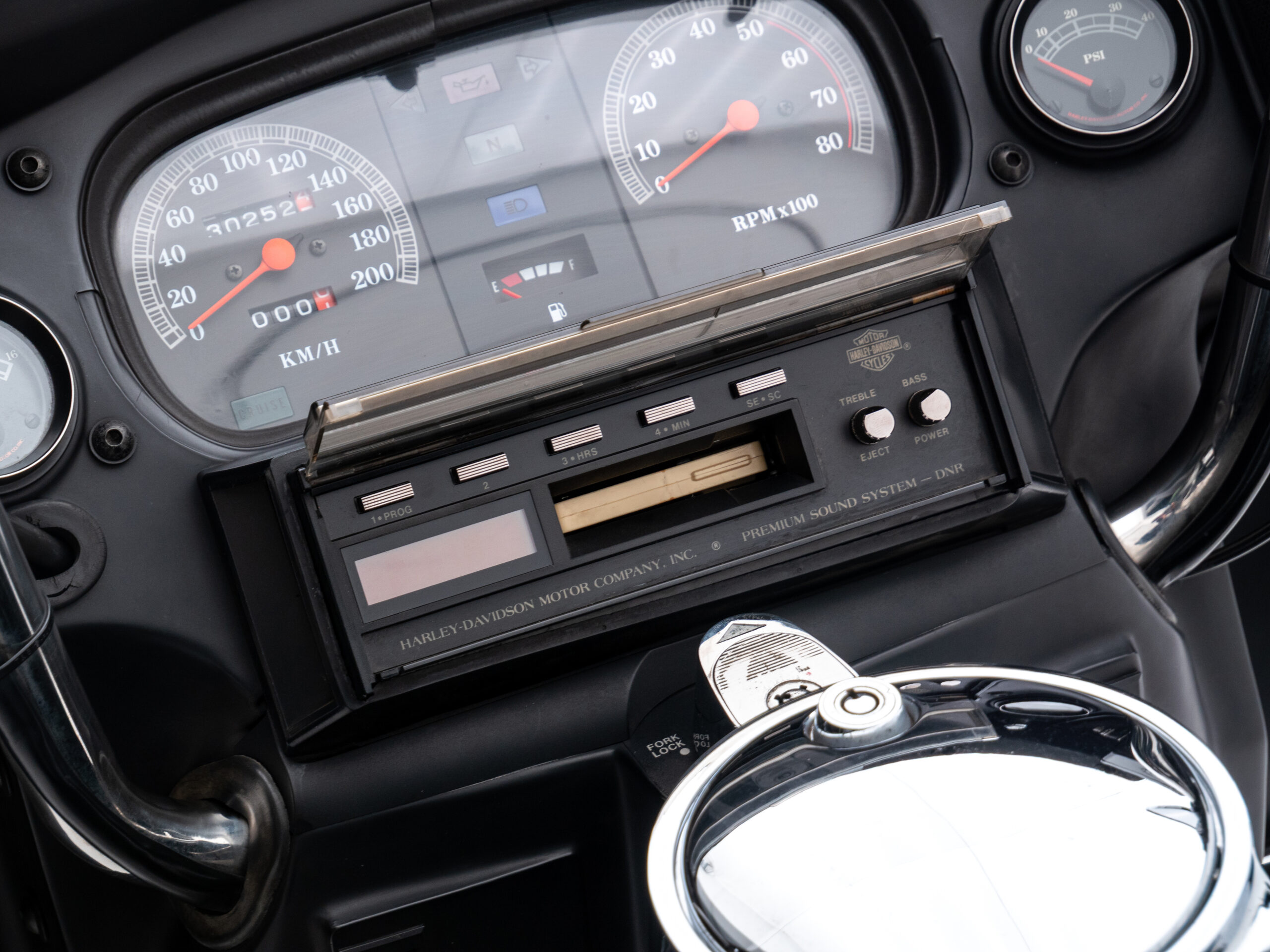O rádio original HD toca fitas, traz um charme retrô que é impossível de ignorar. Com placa preta e um visual cheio de cromados, essa Electra Glide é rara no Brasil e carrega toda a essência da era de ouro da marca.